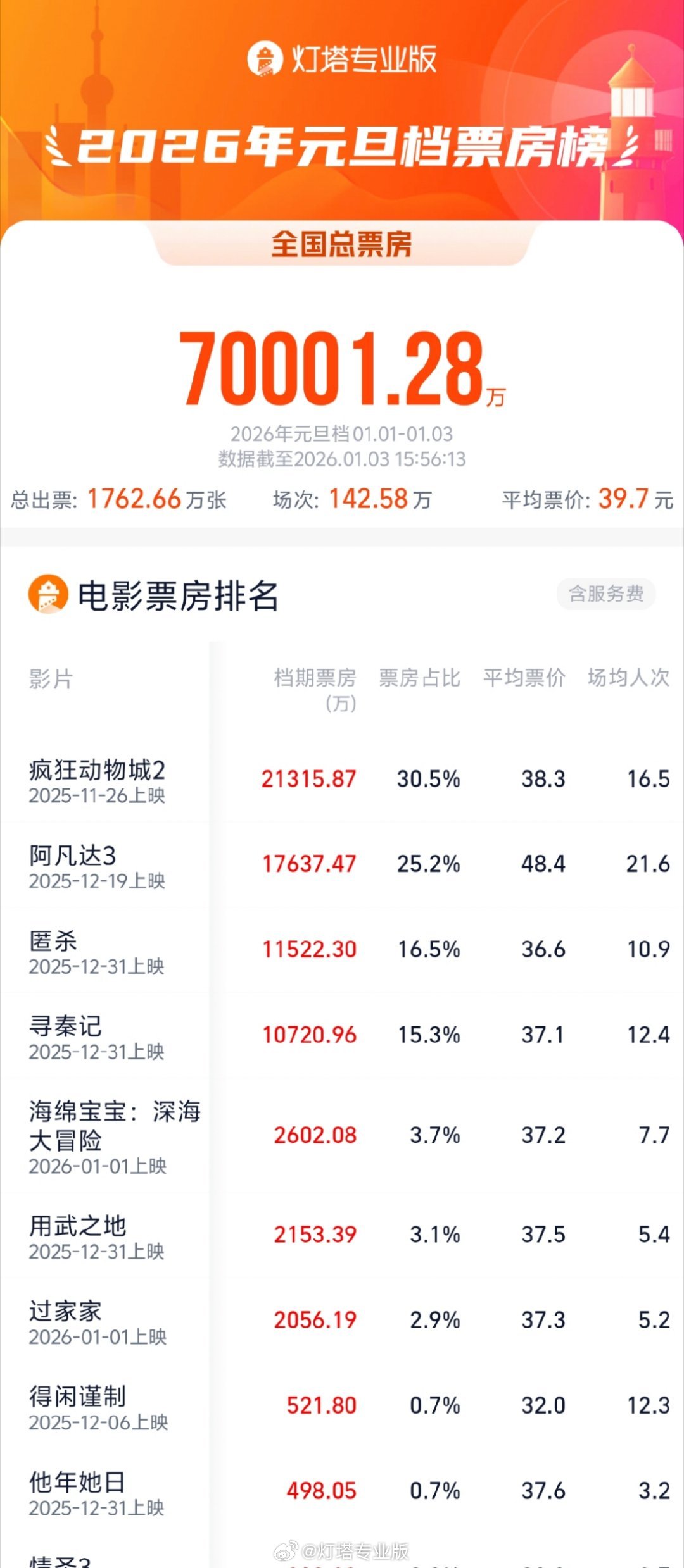 据灯塔专业版,截止1月3日15时56分,2026年元旦档(1月1日—1月3日)档期票房已突破7亿元,影片《疯狂动物城2》《阿凡达3》《匿杀》暂列档期票房前三名。