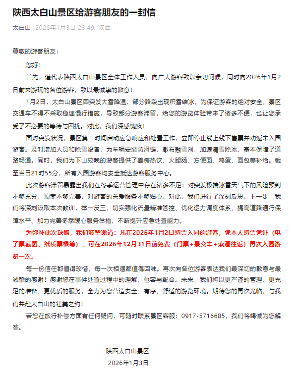 1月3日,陕西太白山景区发布给游客朋友的一封信称,1月2日,太白山景区因突发大雪降温,部分路段出现积雪结冰,为保证游客的绝对安全,景区交通车不得不采取稳速慢行措施,导致部分游客滞留,对此深感愧疚。面对突发状况,景区第一时间启动应急响应和处置工作,立即停止线上线下售票并劝返未入园游客。截至当日21时55分,所有入园游客均安全抵达游客服务中心。凡在2026年1月2日购票入园的游客,凭本人购票凭证(电子票截图、纸质票根等),可在2026年12月31日前免费(门票+景交车+索道往返)再次入园游览一次。