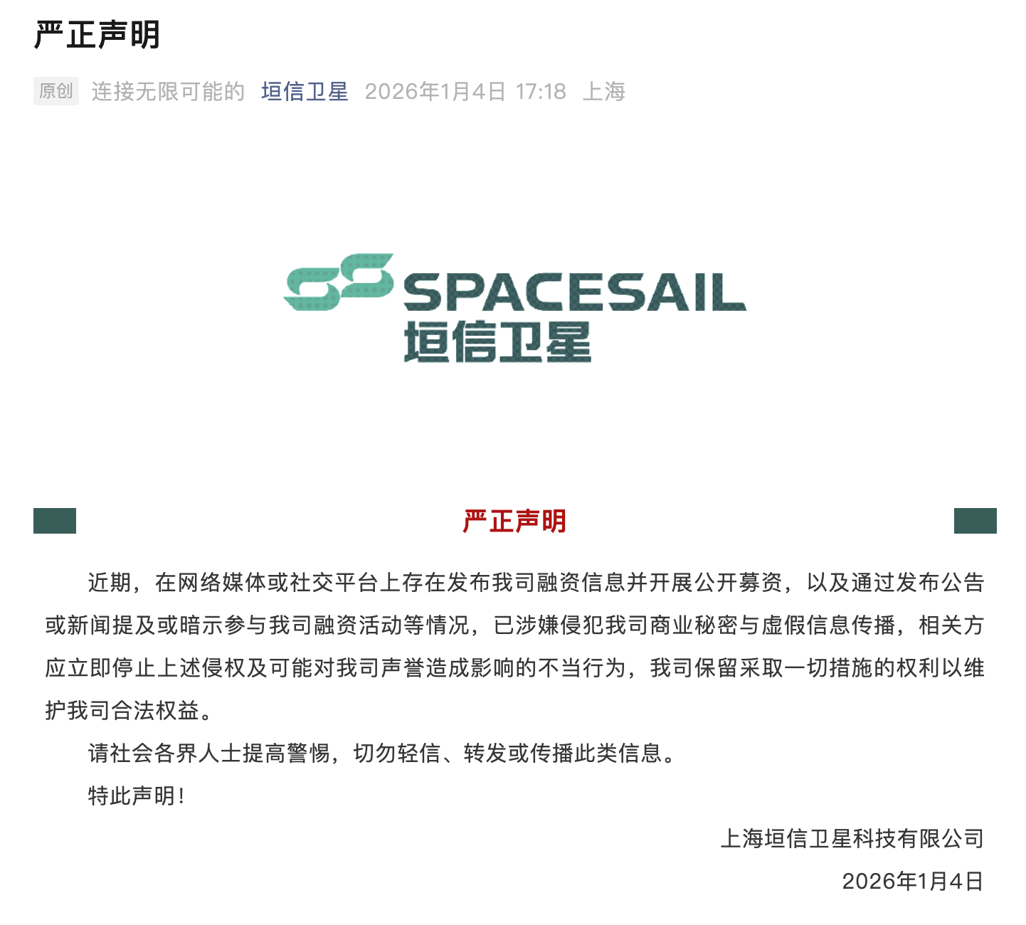1月4日,上海垣信卫星科技有限公司发布声明:近期,在网络媒体或社交平台上存在发布我司融资信息并开展公开募资,以及通过发布公告或新闻提及或暗示参与我司融资活动等情况,已涉嫌侵犯我司商业秘密与虚假信息传播,相关方应立即停止上述侵权及可能对我司声誉造成影响的不当行为,我司保留采取一切措施的权利以维护我司合法权益。