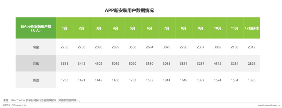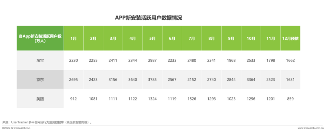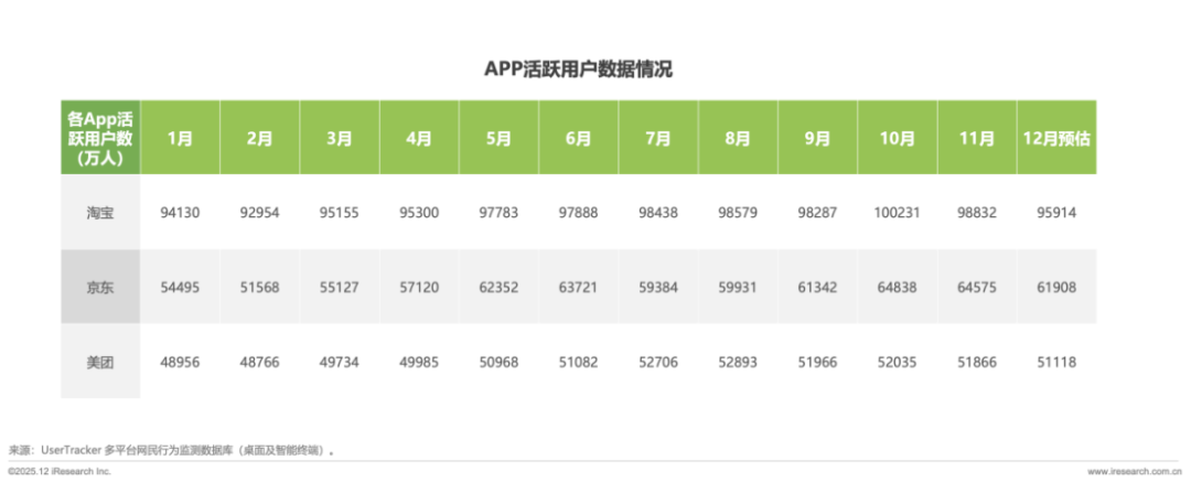 作为外卖市场格局的量化标尺,APP用户活跃情况直接反映平台真实运营规模与市场渗透情况。通过2025 年全年为监测周期、2024 年为基准对比,对三大平台APP追踪全链路用户行为与用户生命周期数据最终推总测算出 2025 年基于APP活跃用户情况的外卖市场份额预测。