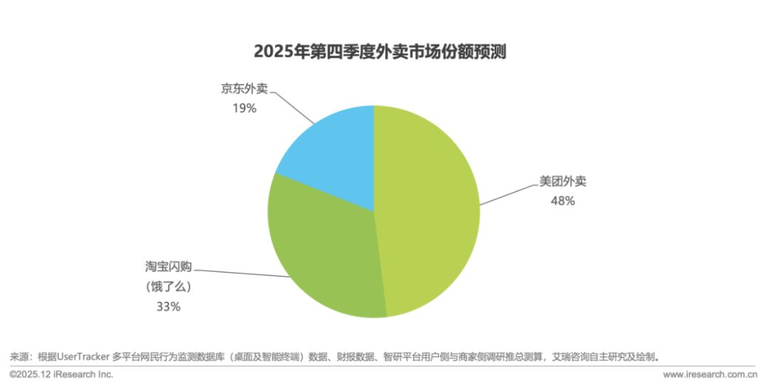 为全面回溯这一瞩目商业事件的脉络,更加立体的分析2025年外卖大战,我们选择APP活跃用户数据、财报数据、以及用户社媒声量数据,结合用户侧与商家侧的调研展开年度盘点。通过多元数据,推总测算2025年Q4季度外卖市场综合份额,预测美团:淘宝:京东=48%:33%:19%。这一数据标志着三家平台在外卖行业已具备稳定的三足鼎力新格局市场,市场结构的均衡性与可持续性显著提升。