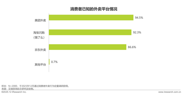 三大平台市场认知度均处于高位水平,美团凭借多年行业积累使平台以94.5%的认知率领先,淘宝闪购(原饿了么)紧随其后达92.3%。京东外卖作为后入局者仍实现86.6%的高认知渗透,印证其渠道铺设与平台推广的高效。三平台形成全民级品牌覆盖。