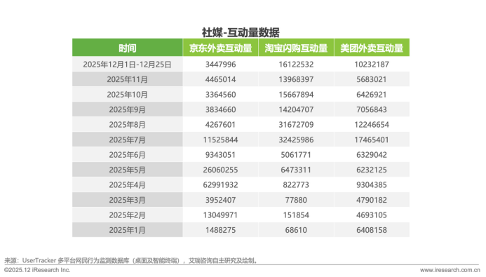 用户声量反映用户对平台的关注度与品牌感知。通过开展2025年全年长周期声量监测,京东、淘宝携带高频营销与高额补贴强势入场后,驱动用户在社媒平台讨论度空前高涨,最后推总测算出基于声量的外卖市场份额预测。