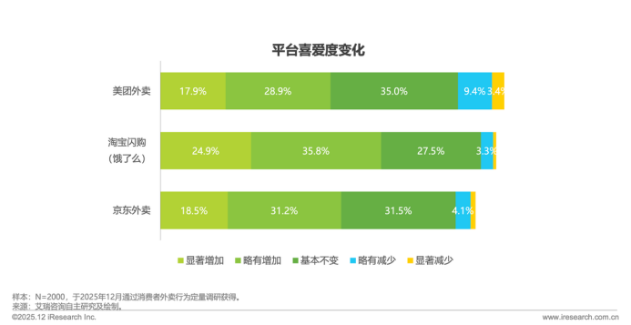 喜爱度数据的反转是用户从惯性到认可平台的关键信号。调研显示,与2024年相比,2025年消费者对淘宝闪购的喜爱度占比显著增加居于高位达24.9%,紧随其后的是京东外卖排名居于第二位,喜爱度占比18.5%,最后美团喜爱度占比17.9%。上述数据表明用户不再单纯依赖单一老牌平台,而是青睐多平台提供的丰富度和差异化服务。