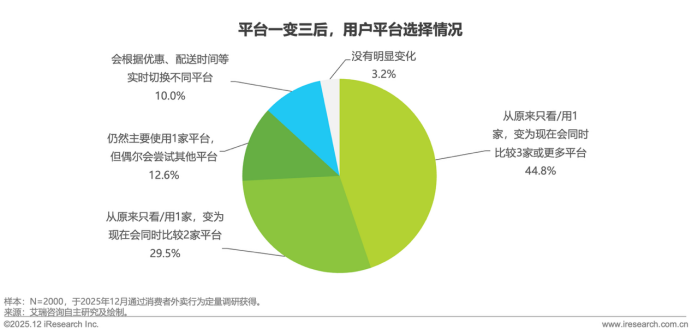 通过调研数据分析,44.8%的用户从原来仅使用一家平台,转变为下单前对比三家,最终会选择出一个更为合适的平台;29.5%的用户会从原来的只看/使用1家平台,变为现在至少同时比较2家平台。多数用户反馈“我会想到要吃的类型,但一般不会想好吃哪家,所以都会看一圈后再决定,去年我主要就是用饿了么和美团外卖,今年加了京东,会三个平台一起对比着点”。用户不再对单一平台产生路径依赖,决策核心从习惯用某平台转变为哪家平台更适配当下需求,这次的外卖大战已成功打破了早期的市场格局。