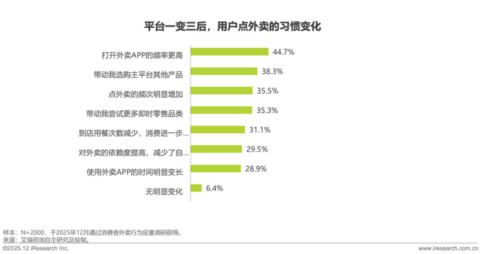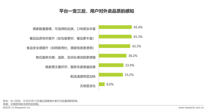 平台的竞争加剧使得行业全面提升质量,外卖消费环境实现显著改善。45.4%的用户感知商家数量激增,供给选择愈发丰富;45.3%的用户认可餐品品质有所提升、43.3%的用户反馈食品安全感持续增强。同时,多维度的服务进一步强化了这一消费趋势,33.9%的用户感受到商家更注重好评、售后服务更完善,33.2%的用户感受到配送速度明显加快;用户感知的供给、品质、安全、服务、配送得到了多维度优化,平台也正在从单一优势转向全链路综合服务能力。