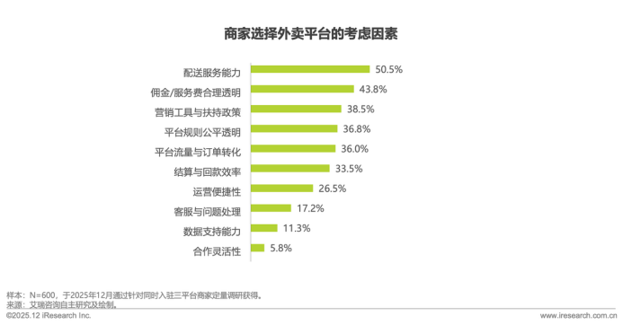 与此前价格补贴主导的竞争不同,商家选择平台的核心逻辑已转向价值维度,调研显示,“配送服务能力”以50.5%超半数居于高位,其次是“佣金/服务费合理透明”(43.8%)、“营销工具与扶持政策”(38.5%)。单纯的补贴力度已褪去核心决策指标。