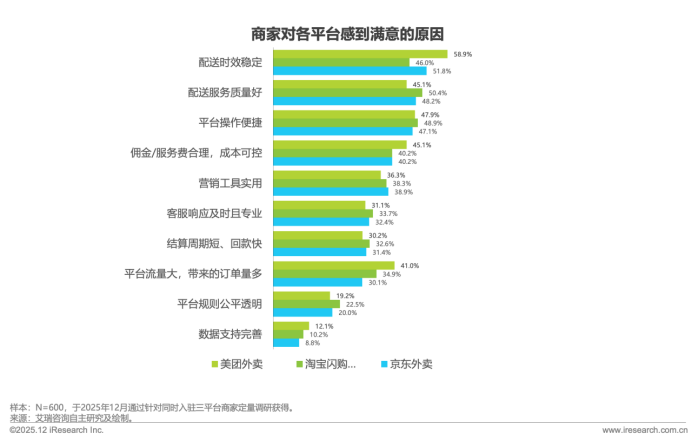这一需求呈现出商家的经营逻辑正从控制成本向提升经营效率与收益能力转型。配送效率保障,专业运营指导、精准数据支持已成为平台赋能新赛道,这也为三大平台指向明确的清晰路径:淘宝的数字化营销工具、京东的强大供应链网络、美团的配送承载能力,三家未来均需通过精准匹配商家需求构建核心竞争力。