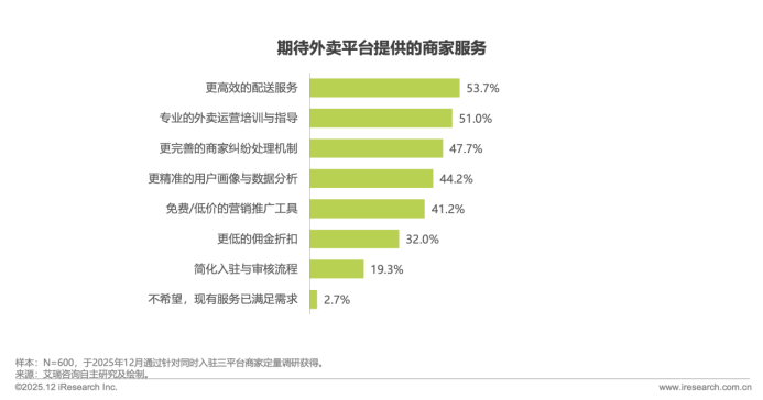 全平台入驻的600个商家中,“更高效的配送服务”以53.7%的占比高居需求榜首;证明市场对履约效率的要求仍在提升,尤其是在订单高峰时段的配送稳定性,已成为商家评估平台服务的核心指标。其次“专业的外卖运营培训与指导”(51.0%),凸显中小商家渴望提升线上运营能力、优化订单转化的迫切性;此外“更完善的商家纠纷处理机制”(47.7%)、“更精准的用户画像与数据分析”(44.2%)“免费/低价的营销推广工具”(41.2%)的需求占比均超四成,成为商家数字化运营的关键点。值得关注的是,“更低的佣金折扣”仅以32.0%的占比位列倒数,印证基础价格补贴已不再是平台吸引商家的核心竞争力。
