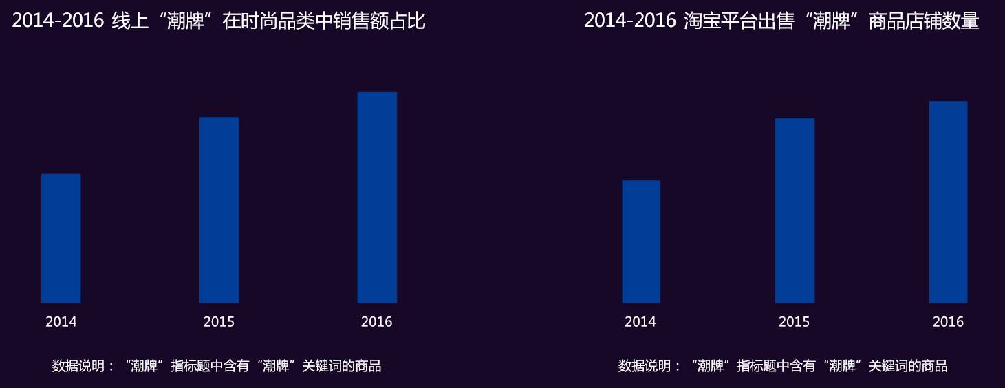 我问你,穿衣服是为了什么,除了文明遮羞,对于很多年轻人而言,是态度的展示。如果你有这方面的需求,那潮牌就是个不错的选择。“回头率”是潮牌与生俱来的基因,或高调或腔调,走在街上就是在宣扬你的独白。根据CBNData x 淘宝iFashion的数据显示,从2014年到2016年,线上“潮牌”不仅在时尚单品中销售占比逐年增长,在淘宝平台上出售“潮牌”商品的店铺数量亦是如此,够“潮”就能让满街的人朝你看!