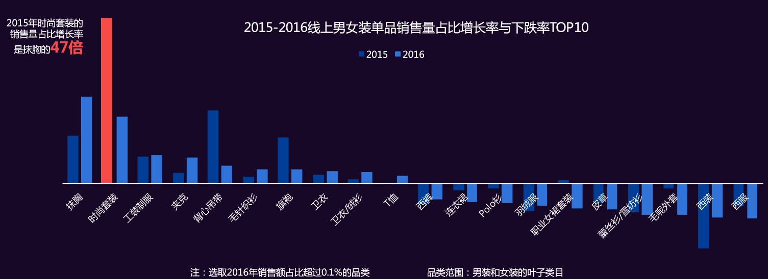 正如CBNData x 淘宝iFashion的数据图所示,从2014年到2016年,时尚套装的消费人数增长率最大,增幅是排名第二的背心吊带单品的23倍!确实,时尚套装提供了整体化的解决方案,实实在在的省心又省力。