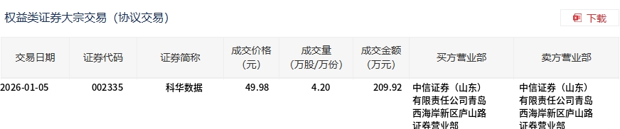 1月5日,科华数据大宗交易成交4.2万股,成交额209.92万元,占当日总成交额的0.11%,成交价49.98元,较市场收盘价57.56元折价13.17%。