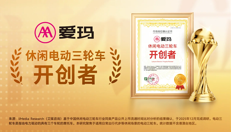 2025年12月,基于艾媒自主研发并获得省部级重大科技专项立项的CMDAS大数据系统监测及严格的调查,以及对中国休闲电动三轮车行业研究比对的结果进行统计确认(统计数据不含中国港澳台地区),爱玛荣获全球领先的新经济产业第三方数据挖掘和分析机构iiMedia Research(艾媒咨询)授予的“休闲电动三轮车开创者”市场地位确认。