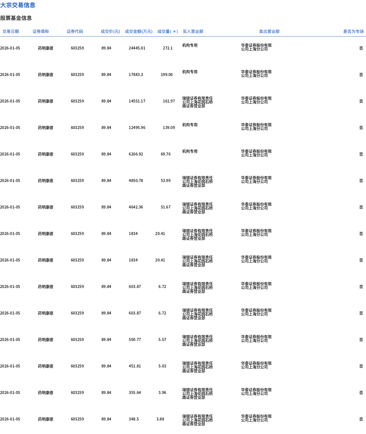 1月5日,药明康德大宗交易成交1033.84万股,成交额9.29亿元,占当日总成交额的11.89%,成交价89.84元,较市场收盘价94.57元折价5%。