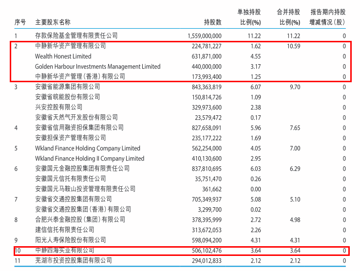 中报显示,截至2025年6月末,中静新华仍为徽商银行的第二大股东,合并持股10.59%。中静新华及其控股的中静四海,合计持有徽商银行14.23%股权。