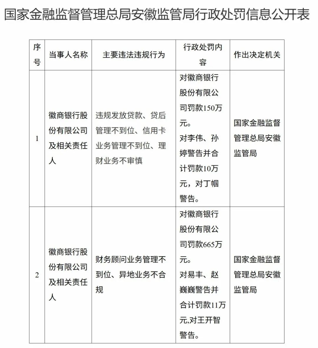 12月5日,监管处罚信息显示,徽商银行存在违规发放贷款、贷后管理不到位、信用卡业务管理不到位、理财业务不审慎四项违法违规行为,监管部门对徽商银行罚款150万元,同时对两位相关负责人李某、孙某警告并合计罚款10万元,对相关负责人丁某警告。