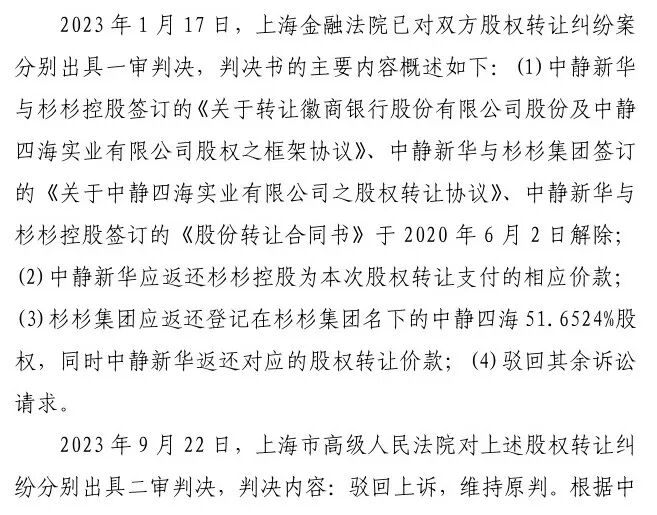 2019年8月,中静新华与杉杉控股签订了资产转让《框架协议》,中静新华将持有的徽商银行224781227股内资股份、中静四海实业有限公司(以下简称“中静四海”)的51.6524%股权、中静新华境外子公司合计持有的徽商银行1245864400股H股股份,共三项资产转让给杉杉控股,合计转让价格为121.5亿元。