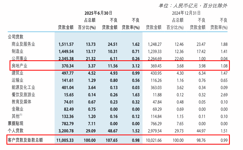 分行业来看,该行房地产业不良双升。截至2025年6月末,房地产业不良贷款余额上升至11.56亿元,较年初增长190.45%。不良贷款率从2024年末的1.08%大幅攀升至3.12%,较全行0.98%的整体不良率高出2.14个百分点,成为徽商银行不良率最高的行业。