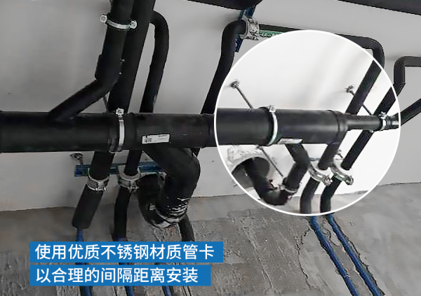 吉博力HDPE管道采用热熔焊接工艺,同材质无缝对接,配合使用优质不锈钢材质减震管卡,以合理的间隔距离安装,能安全受力,有效隔绝结构传声,减少排水时管道的震动和抖动,降低噪音。整体安装上,选用小弯头或减少弯头,减少和避免水流方向变化产生的噪音。保证了管道系统的长期稳定性,更让住宅排水静音效果落到实处。