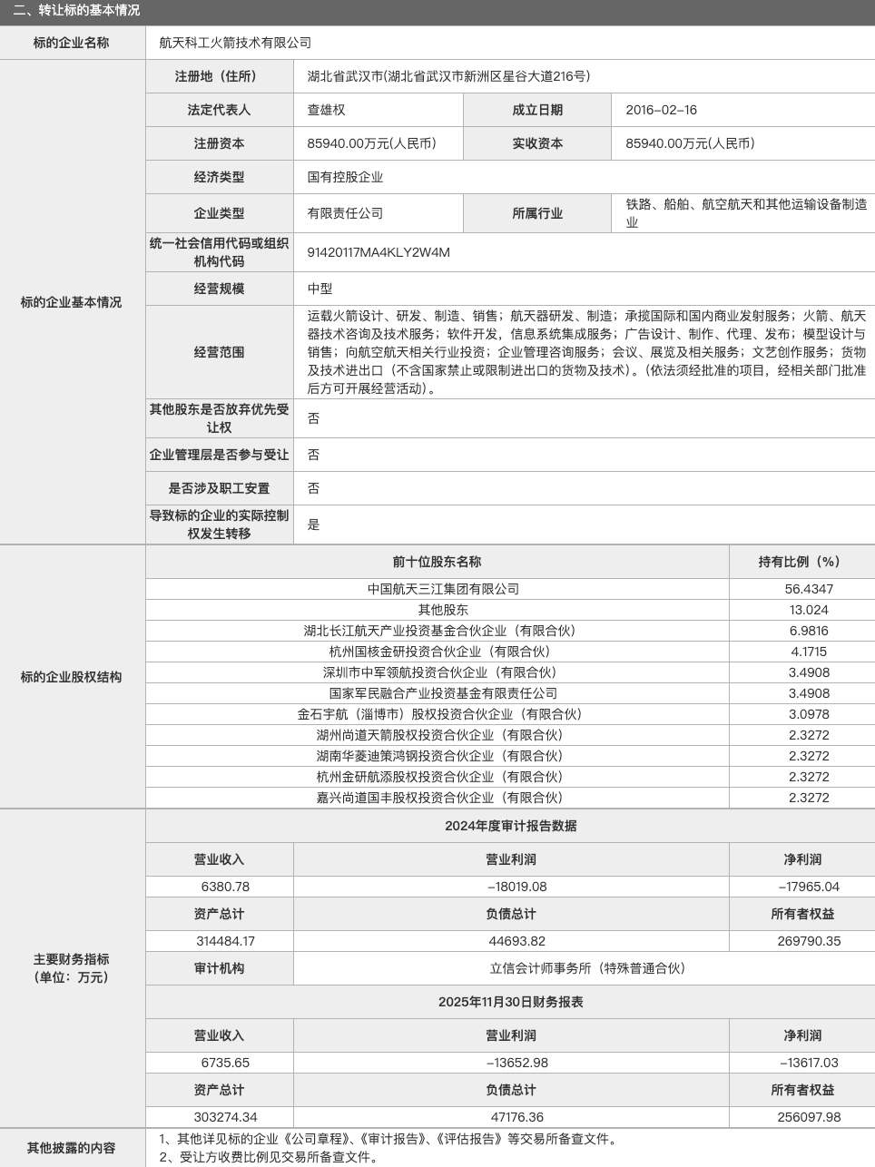 1月6日,北京产权交易所信息显示,中国航天三江集团有限公司于近日挂牌转让航天科工火箭技术有限公司29.5904%股权,转让底价为329985万元。资料显示,航天科工火箭主要从事运载火箭设计、研发、制造、销售,航天器研发、制造,承揽国际和国内商业发射服务,火箭、航天器技术咨询及技术服务等。