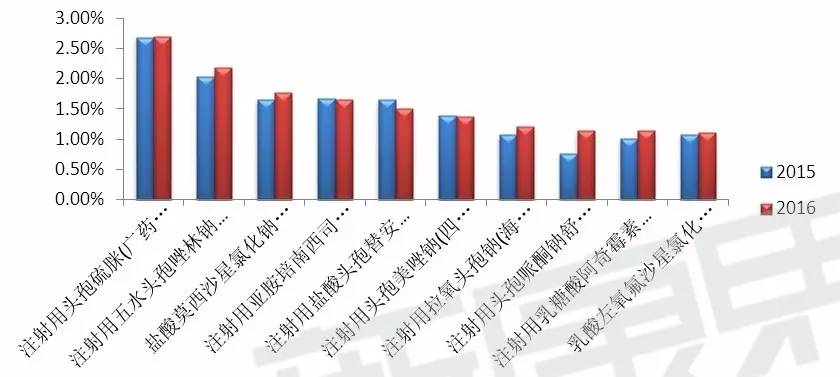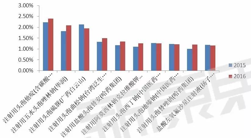 2016年,β-内酰胺酶抑制剂销售额出现轻微下滑。其中,头孢类领跑全场。