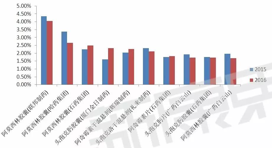 抗生素与合成抗菌素零售药店TOP 10品牌份额