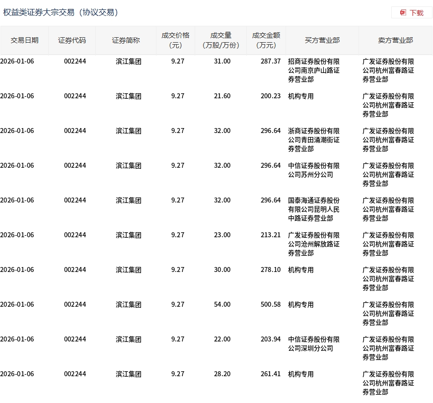 滨江集团今日大宗交易折价成交1041.74万股,成交额9500.59万元