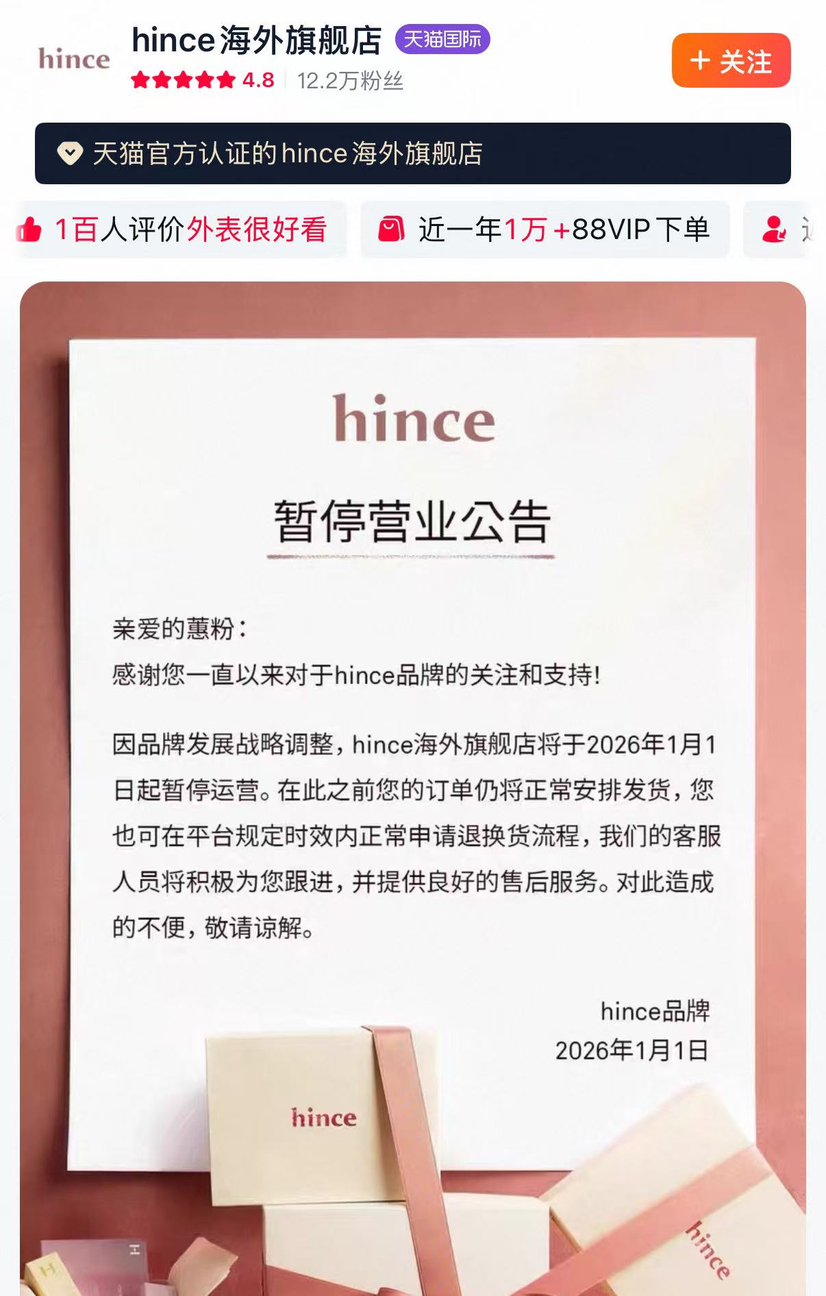 事实上,这不只是菲洛嘉单个品牌的困扰。同样是在2026年的新年第一天,因品牌发展战略调整,LG生活健康旗下彩妆品牌hince天猫官方旗舰店及其海外旗舰店双店齐关,目前两个店铺中的商品已全部下架。