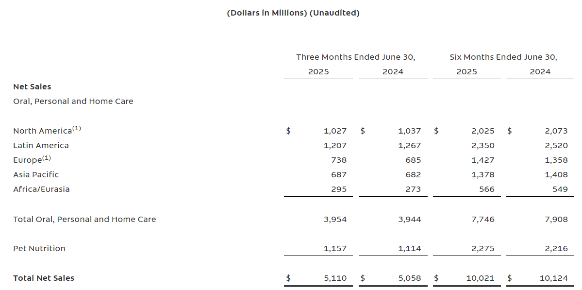 2025年上半年,高露洁公司核心业务口腔、个人和家庭护理板块净销售额与营业利润双降,其中亚太区(含中国)三大核心业务的净销售额下降2.13%。