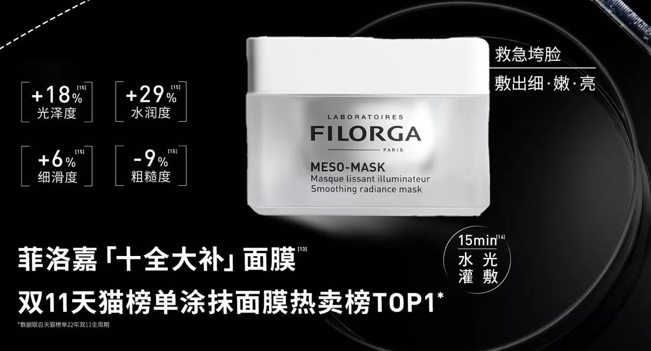 在资本的加持下,菲洛嘉在线上势如破竹。根据品牌微信公众号,旗下“胶原水光瓶”在新品上市期就登上了天猫榜单精华热卖榜TOP1(数据取自2022年5月2日-5月5日);明星单品“十全大补面膜”更是位居2022年双11全周期天猫榜单涂抹面膜热卖榜榜首。