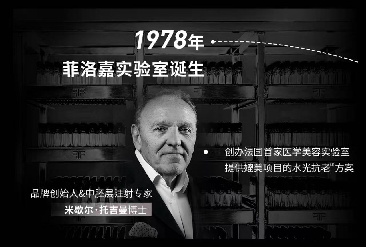 公开资料显示,菲洛嘉由法国医学美容专家、细胞生物学博士Michel Tordjman创立,定位院线级专业护肤品牌。1978年,Michel Tordjman创办菲洛嘉实验室,宣称其为法国首个医学美容实验室,旨在开发一系列以透明质酸为配方的化妆品,并将医学美容注射剂中使用的活性成分扩展至尖端化妆品配方的新应用领域,专注于研发和提供医美级水光抗老方案。1988年,该实验室打造出一种基于中胚层疗法的水光同源成分NCTF动能素——一种包含超过50多种活性成分的复合物。经过科学复配水光注射剂所用的同源成分,2007年,菲洛嘉水光护肤品诞生,NCTF也成为菲洛嘉护肤系列产品的核心成分。