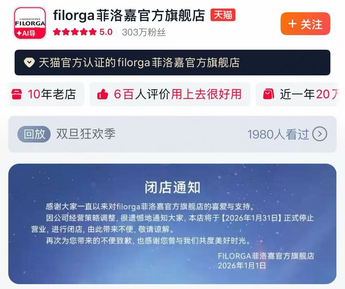 2026年1月1日,法国院线护肤品牌Filorga菲洛嘉天猫官方旗舰店发布闭店公告,称因公司经营策略调整,店铺将于2026年1月31日正式停止运营并闭店。截至目前,该店铺拥有303万粉丝,近50个SKU在售,其明星单品“十全大补面膜”显示已售3万+件。
