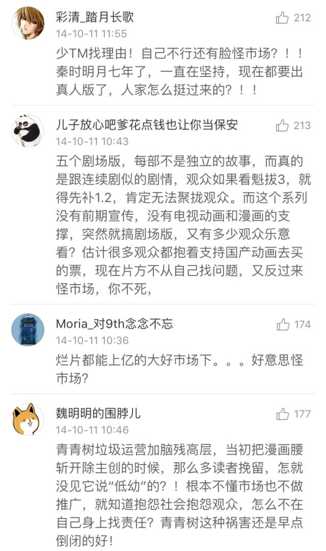 这是2014年10月11日@时光网Mtime 发布《魁拔》延期消息时的粉丝评论