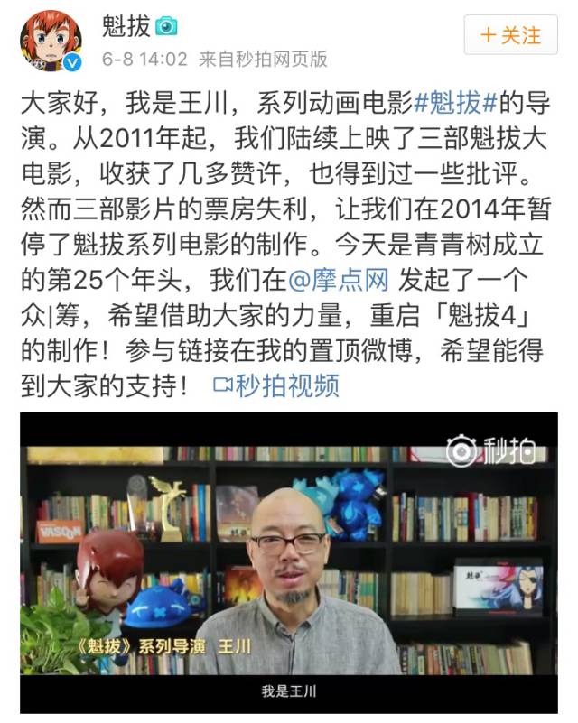《魁拔》系列动画的导演叫王川,他也是青青树的创始人。在众筹开启时,他通过了一段视频对外讲述了为什么要借助大家的力量,重启《魁拔4》的制作(有删节):