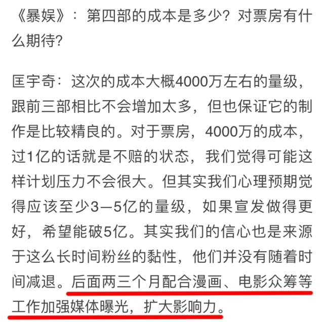 可以看到的是,在这场访谈中,匡宇奇对外透露了《魁拔4》未来的宣发计划:“后面两三个月配合漫画、电影众筹等工作加强媒体曝光,扩大影响力。”