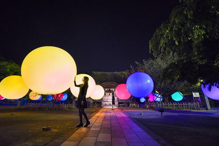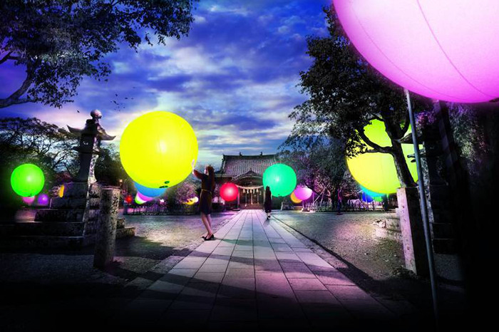 这一装置艺术位于日本长崎大村公园内的大村神社,“浮游”在空中的发光球体们传达着自律的光芒——在耀眼后消失,就像呼吸一样充满节奏。球体在被人触碰,或是受到外力后,光的颜色就会发生变化,并发出特有的声音。之后,附近的球体也会感知,在发出同样颜色的光和响声。触动、反馈、消失,这些具有宗教哲学意义的存在形态,通过更易被接纳的艺术效果,在神社这样的古老空间里为人们带来新的启示。