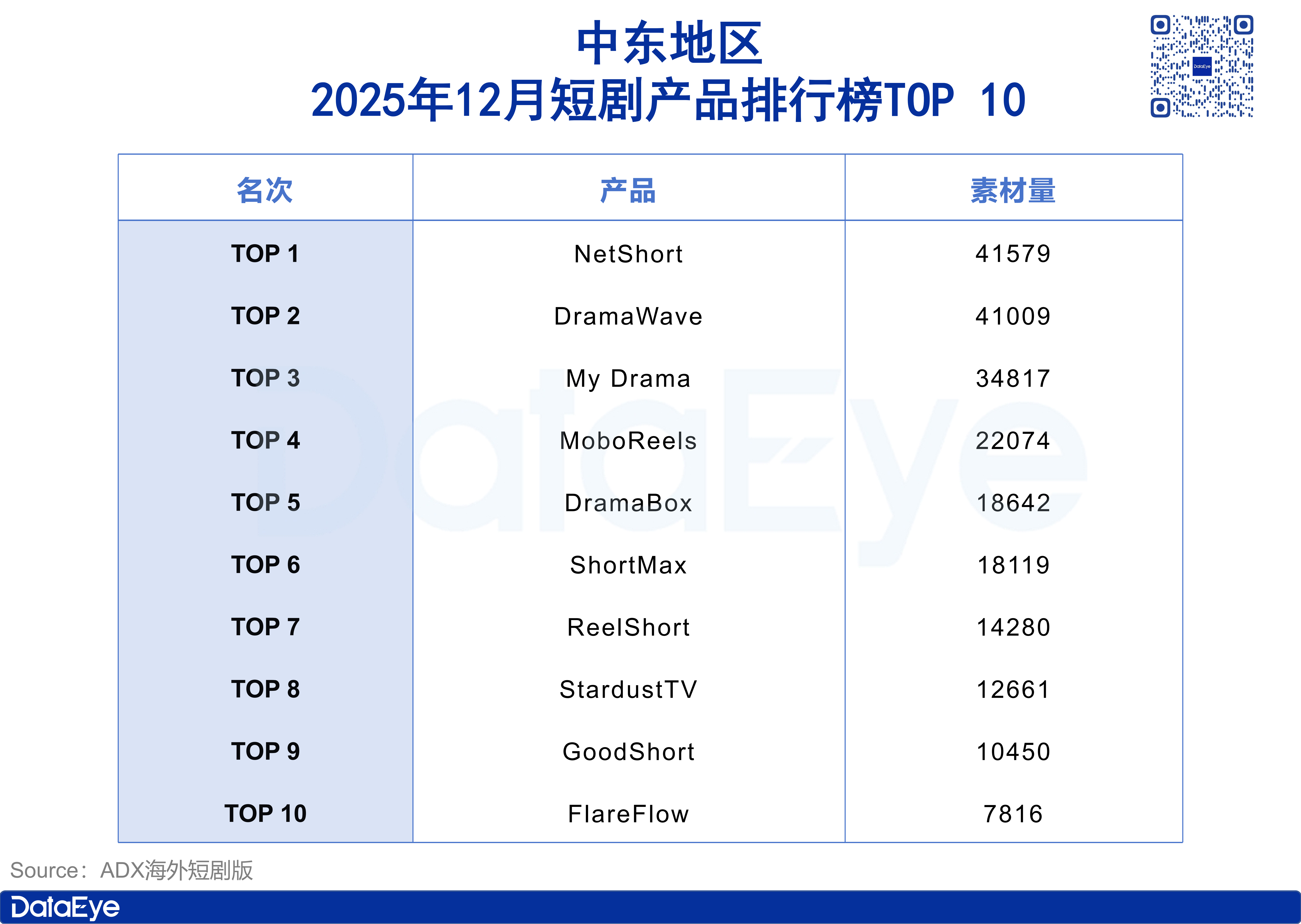 在产品方面,ADX海外短剧版数据显示,中东地区主要市场(沙特、阿联酋、卡塔尔、阿曼、科威特、巴林、以色列)2025年12月累计投放素材量31.4万组。