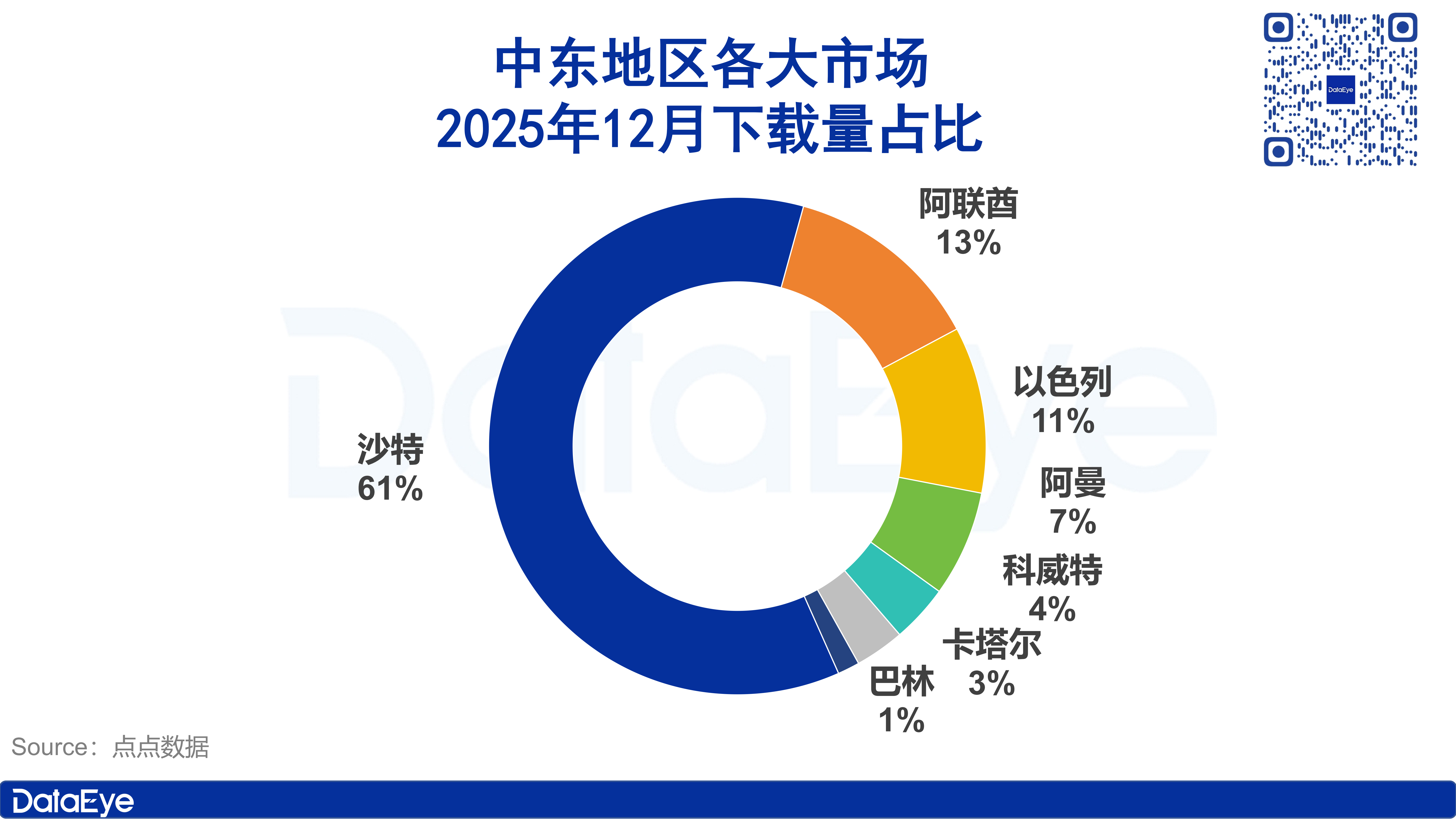 在各细分市场,以上述TOP 10产品为样本,下载量方面,沙特以136.9万次下载量占据了中东地区主要市场的61%,遥遥领先于其它市场。