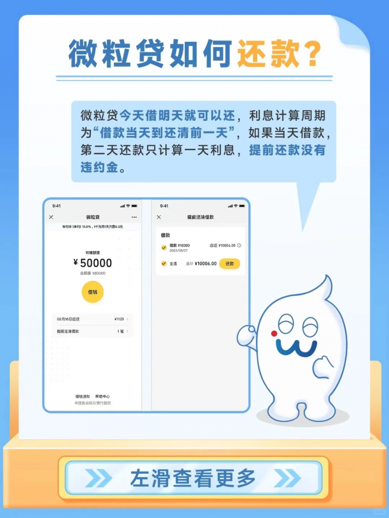 提前还款:微粒贷支持提前还款,最快可在借款次日提前还清,按日计息,且不收取任何违约金。