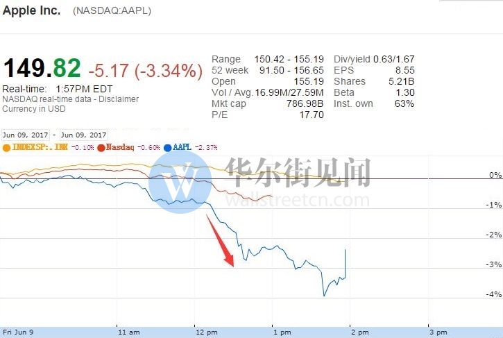 本周五正在上演这样的危险戏码:北京时间零点40分左右,苹果回吐盘初0.1%的涨幅,跌幅突破2.7%,纳指跌幅也扩大到0.7%,标普500和道指也不同程度回吐涨幅。