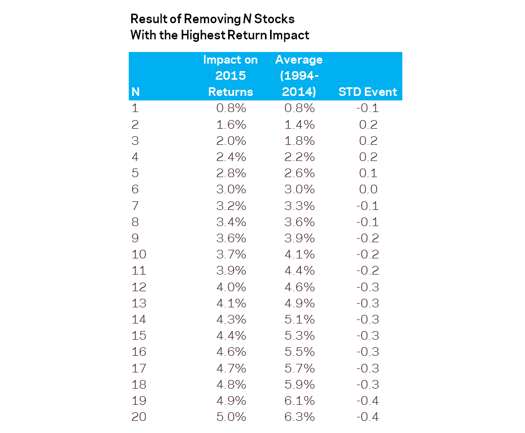 去年AQR资产管理公司研究1994~2015年大公司对标普500指数的贡献发现,不仅是在2015年,其他年份美国股市投资收益也主要是由少数公司撑起。