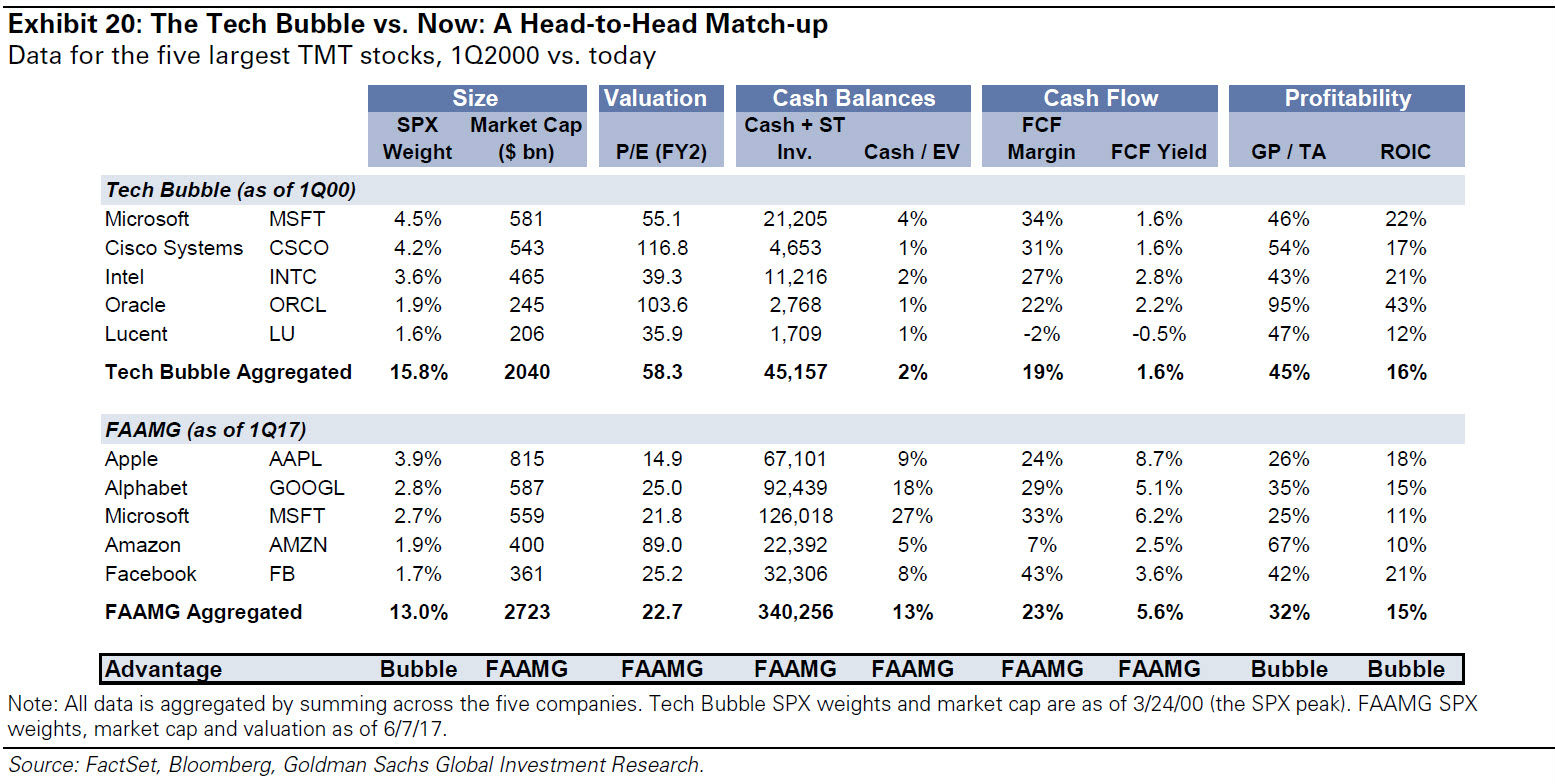 如果担心FAAMG可能重演本世纪初科技股泡沫破裂惨剧,应该看看以下高盛对比图表。