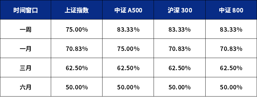 表:八连阳后不同时间区间内主要指数收益优于沪指的概率