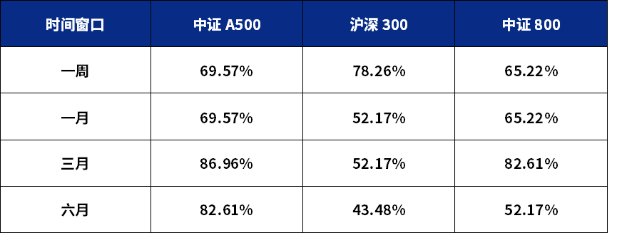除此之外,在A股出现“八连阳”行情后,中证A500指数相对于上证指数体现出了一定的超额收益潜力。其中,一周后跑赢上证指数的概率约为69.57%,与短期表现最强的沪深300(胜率78.26%)存在一定差距;但随着时间窗口拉长,其相对优势逐步显现,一个月后跑赢上证指数的概率保持近70%,三个月后胜率攀升至86.96%,六个月后胜率仍维持在82.61%的高位。与之相比,沪深300、中证800指数在中长期跑赢沪指的概率则出现明显回落。这一统计特征可能反映出,在普涨行情后的市场分化阶段,行业覆盖更广、成分结构更均衡的中证A500,在历史上更易于延续相对优势。