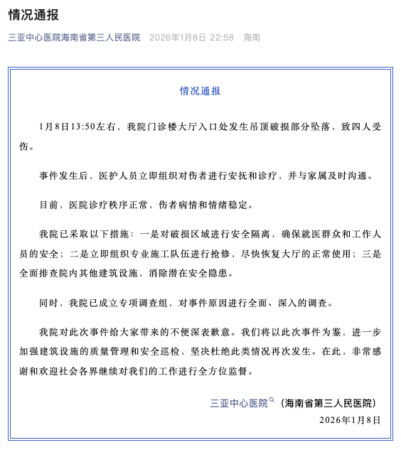 1月8日,三亚中心医院(海南省第三人民医院)发布情况通报:1月8日13:50左右,我院门诊楼大厅入口处发生吊顶破损部分坠落,致四人受伤。事件发生后,医护人员立即组织对伤者进行安抚和诊疗,并与家属及时沟通。目前,医院诊疗秩序正常,伤者病情和情绪稳定。同时,我院已成立专项调查组,对事件原因进行全面、深入的调查。我院对此次事件给大家带来的不便深表歉意。