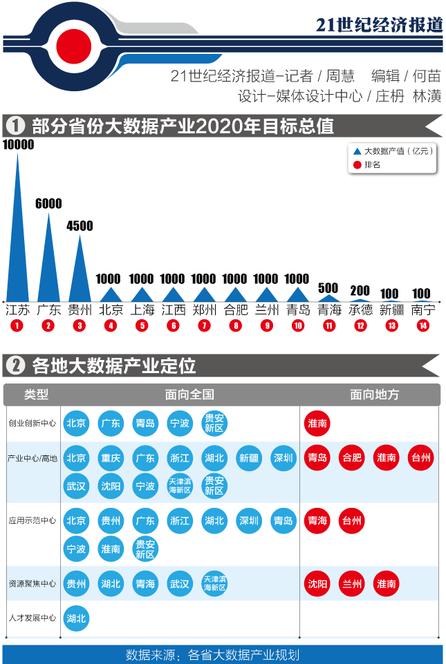 37个省市中有20个明确提出了各自的大数据产值,其中江苏到2020年的是超过1万亿元,即超过工信部2020年的目标;广东的这一目标是6000亿,贵州为4500亿,北京、上海相对低调,2020年的目标产值是1000亿元。