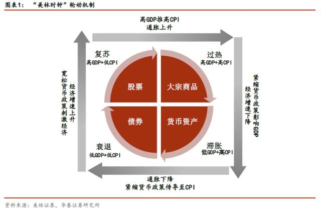 美林时钟是2004年由美林证券通过对超过30年的数据统计分析得出的资产配置模型,将经济周期分为四个阶段:复苏、过热、滞胀、衰退,分别对应股票、商品、现金和债券四种优质资产。模型在分析2008年金融危机后美国大类资产的配置中表现出了其参考价值。