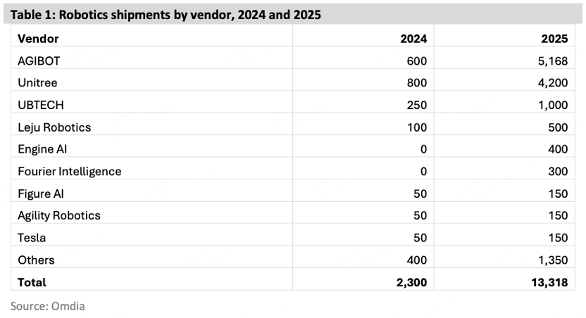 1月8日,界面新闻记者获悉全球权威市场研究机构Omdia正式发布《通用具身机器人市场雷达》报告。报告显示,2025年全球人形机器人市场总出货量预计达1.3万台。其中,中国公司智元出货量达5168台,占全球39%市场份额,位居第一;宇树出货量4200台,市占率32%,位列第二。