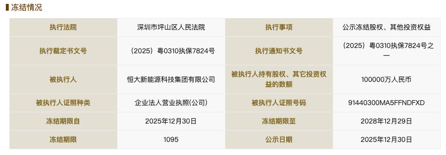 国家企业信用信息公示系统网站显示,2025年12月30日,恒大新能源科技集团有限公司新增一则股权冻结信息,股权所在企业为恒大新能源科技管理(深圳)有限公司,冻结股权数额10亿人民币,冻结期限为3年,执行法院为深圳市坪山区人民法院。