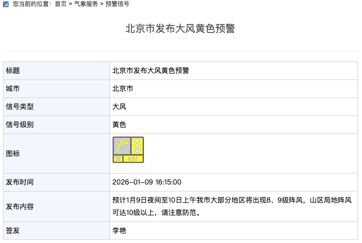 北京市发布大风黄色预警:预计1月9日夜间至10日上午北京市大部分地区将出现8、9级阵风,山区局地阵风可达10级以上,请注意防范。